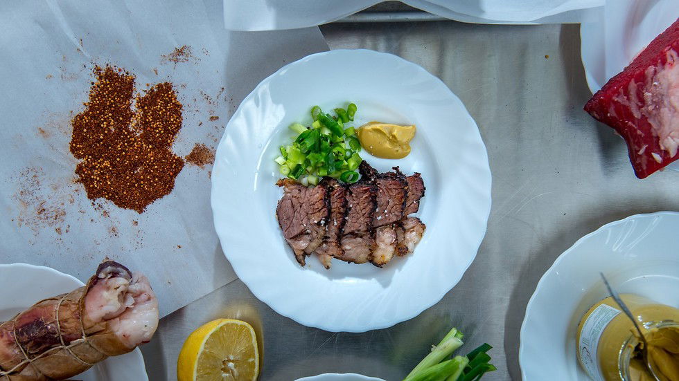 מפזרים בנדיבות על נתח הבשר, ומעסים היטב. מעבירים למקרר ללילה (מכוסה).