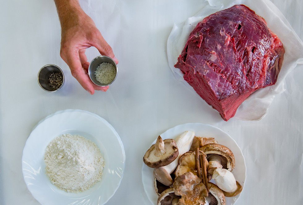 מערבבים את כל החומרים בקערה יחד עם הפטריות, למעט המלח והפלפל.