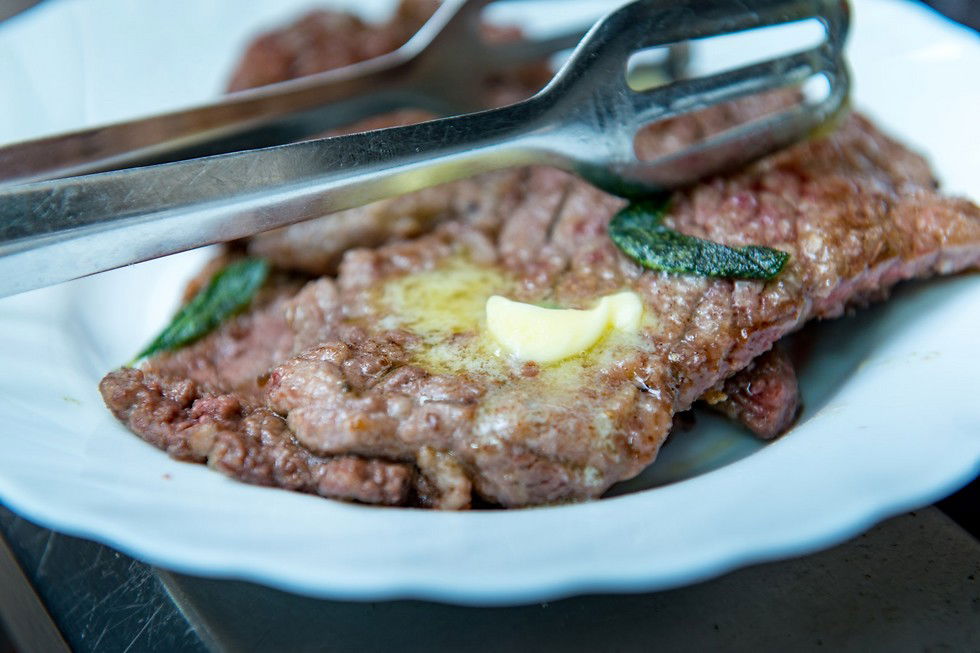 מוסיפים 20 גר' חמאה נוספים, מזיזים את המחבת כדי שהחמאה תימס בצורה אחידה ומתבלים במלח ופלפל שחור.